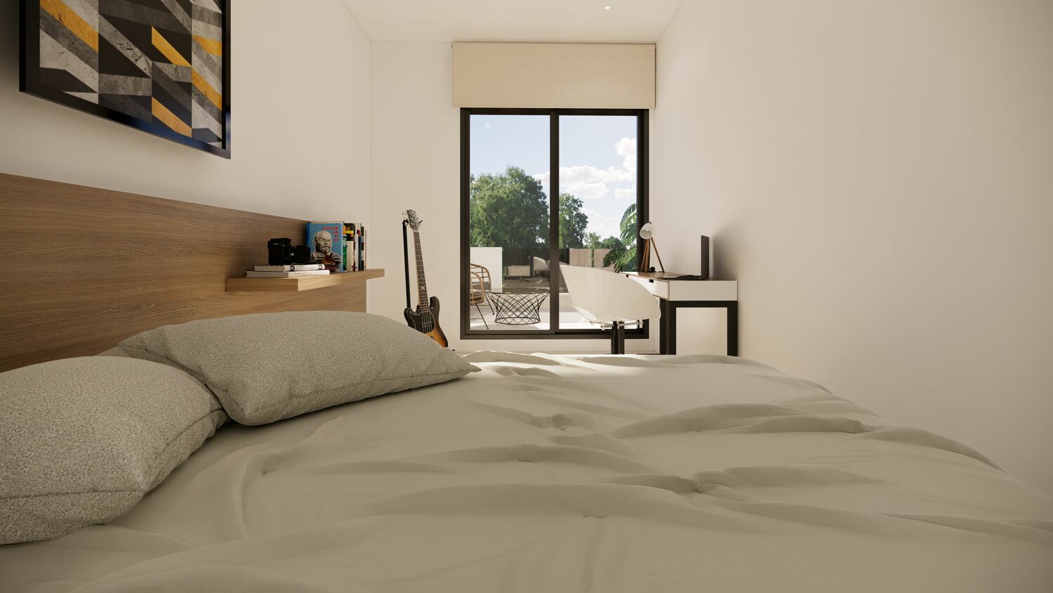 Diese freistehenden Villen mit einer Wohnfläche von 116 m² zeichnen sich durch die Verwendung teilweise holzgemaserter Fliesen aus, die einen schönen Kontrast zu den weißen Wänden des Hauses bilden. Das Haus hat zwei Etagen. Das Erdgeschoss verfügt über ein Wohnzimmer mit einer modernen offenen Küche. Es gibt eine separate Toilette und ein Schlafzimmer mit eigenem Bad. Die Treppe zum Obergeschoss ist schön verarbeitet. Im Obergeschoss befinden sich zwei weitere Schlafzimmer und ein Badezimmer. Angrenzend an die Schlafzimmer befinden sich zwei große Terrassen, die durch Schiebetüren zugänglich sind. Der Swimmingpool ist 14 m² groß und kann bei Bedarf erweitert werden. Es gibt auch eine Außendusche. Die Villen haben alle eine private Auffahrt und einen separaten Waschraum im Freien. Das Haus hat vorne und seitlich eine große Terrasse, die teilweise mit Kunstrasen bedeckt ist.