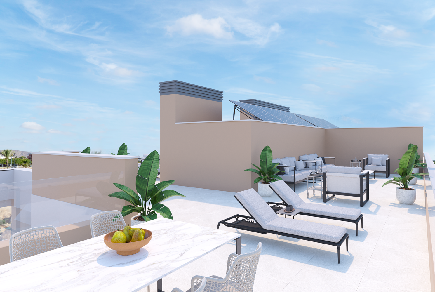 Diese luxuriösen Penthäuser mit einer Wohnfläche von 100 m² verfügen über drei Schlafzimmer und zwei Badezimmer, eines davon en suite. Das großzügige 44 m² große Wohnzimmer bietet eine offene Küche, deren Ausstattung teilweise im Preis inbegriffen ist. Eine Terrasse erstreckt sich über die gesamte Breite des Gebäudes, eine weitere nach vorne. Das Solarium ist 86 m² groß. Im gemeinschaftlichen Innenhof befinden sich ein schöner Swimmingpool und ein Kinderspielplatz. Ein Stellplatz mit Abstellraum befindet sich in der Tiefgarage, zusätzlich steht ein privater Außenstellplatz zur Verfügung.