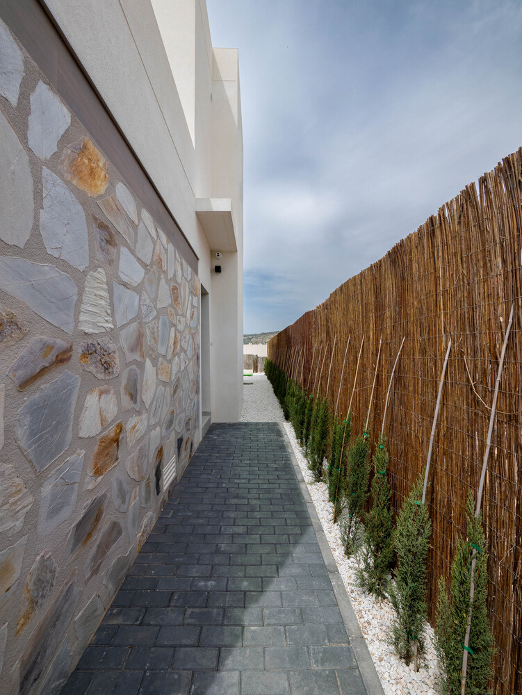 Key Ready – Enjoy immediately! These elegant villas, enhanced with beautiful natural stone accents, extend over two floors and offer a bright living room with an open-plan kitchen and a spacious garden surrounding them. The private driveway and refreshing swimming pool complete the outdoor living experience. Situated on the popular La Finca Golf Resort, both the hilly golf course and the elevated clubhouse are just about 600 meters away.