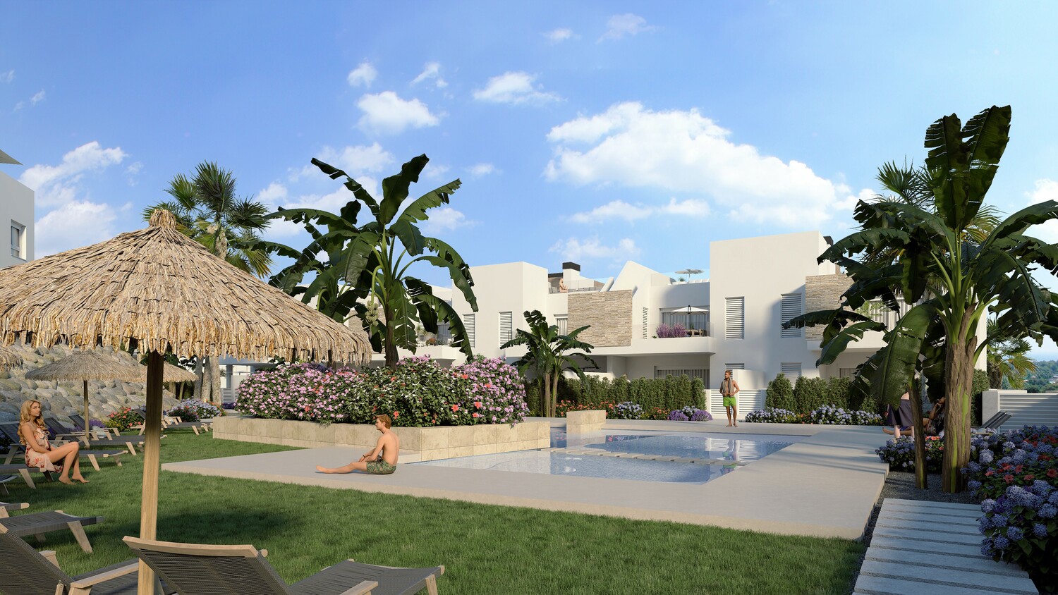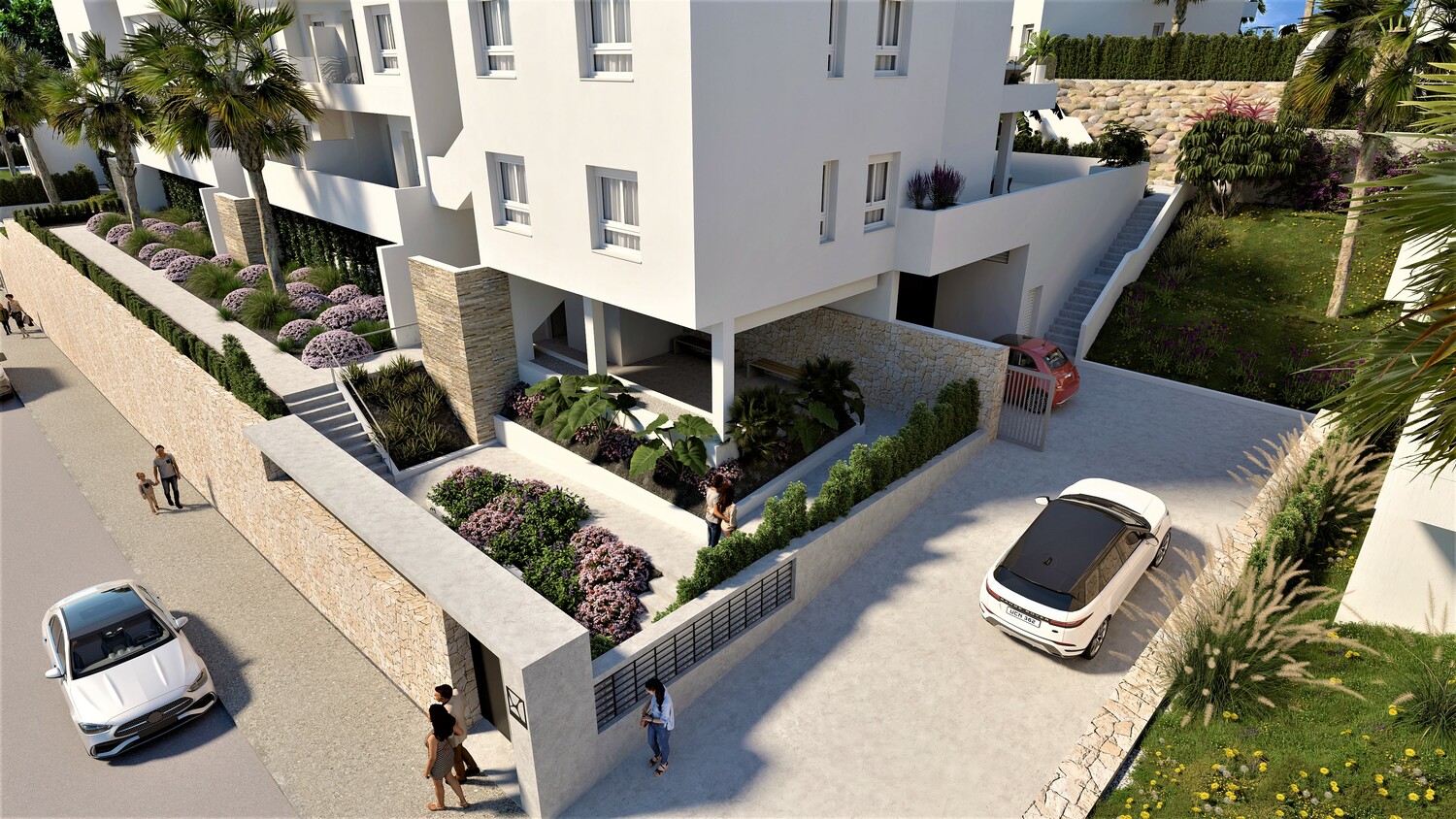 The Penthouses with 2-3 bedrooms and 2 bathrooms, 1 en-suite, are surrounded by different types of beautiful Villas. This gives the district a very luxurious appearance. The solarium with stunning views has an area of no less than 72 m2 in the 2-bedroom Penthouses, and 88 m2 in the 3-bedroom Penthouses. The houses are equipped with a cooking island, underfloor heating in the bathrooms and the entire Penthouse has an integrated air conditioning system. In addition, there is a spacious separate laundry room / storage room. In addition to a large swimming pool and a lovely sunbathing area, the communal area has a very beautiful and carefully landscaped garden with special plants and alternating rocky natural stone walls used to embellish the height differences. A parking space with storage in the underground parking garage is an option for these homes.