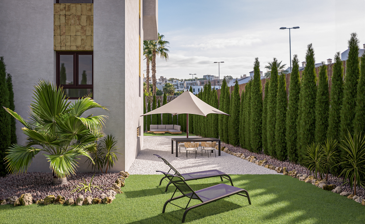 Deze moderne Penthouses van 74 m2 met 2 slaapkamers en 2 badkamers waarvan 1 badkamer en suite worden gebouwd in een erg mooie Mediterrane wijk in Villamartin. De Penthouses hebben een terras van 8,4 m2 en een solarium variërend van 65 m2 tot 95 m2. De gemeenschappelijke ruimte heeft een groot zwembad en een aangelegde tuin. De woningen zijn geschikt voor zowel permanente bewoning als verhuur en worden opgeleverd inclusief alarmsysteem, elektrische rolluiken, pre-installatie van airconditioning, een domotica systeem en een garage met berging.